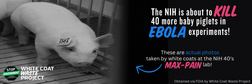 Each year, over $20 billion of your tax dollars are wasted to torture animals in mad science experiments funded by bureaucrats in white lab coats. Many labs violate federal spending and transparency laws. The NIH ripped 40 two-week-old baby pigs from their mothers and infected them with Ebola at its dangerous taxpayer-funded bioagent superlab in Montana. The baby pigs will suffer fevers, weight loss, respiratory distress, paralysis, and brain damage in these maximum pain experiments where no relief is provided.